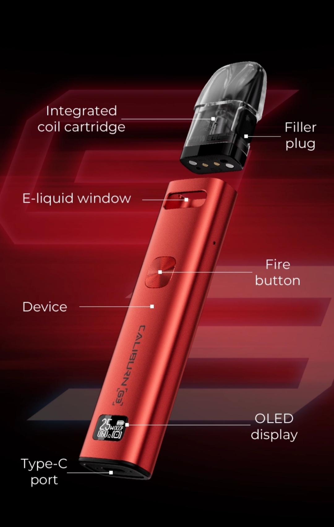 علاوه بر این، کارتریج های Caliburn G3 حاوی یک کویل ۰.۶ یا ۰.۹ اهم هستند که از حداکثر ۲۵ وات قابل تنظیم برای ویپینگ استفاده میشود.